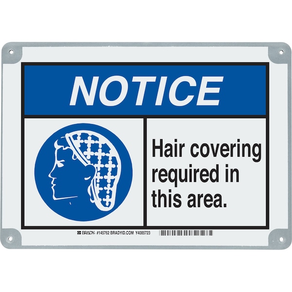 Notice Sign, Sign Subject Matter Personal Protection, Height 7 in, Width 10 in, Sign Material Plastic, Sign Mounting Style With Mounting Holes, Header Notice, Legend Hair Covering Required In This Area, Printed Language English, Sign Shape Rectangle