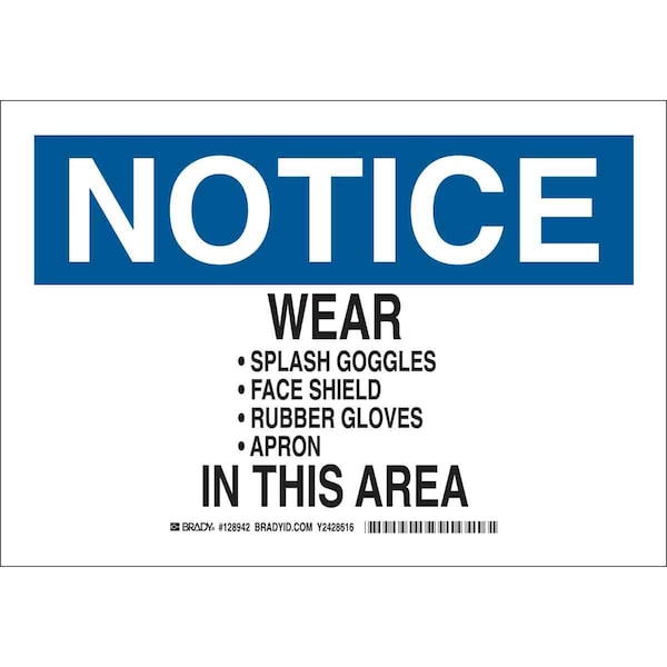 Notice Sign, Sign Subject Matter Personal Protection, Height 7 in, Width 10 in, Sign Material Polyester, Sign Mounting Style Adhesive Surface, Header Notice, Legend Wear Splash Goggles Face Shield Rubber Gloves Apron In This Area, Printed Language English, Sign Shape Rectangle