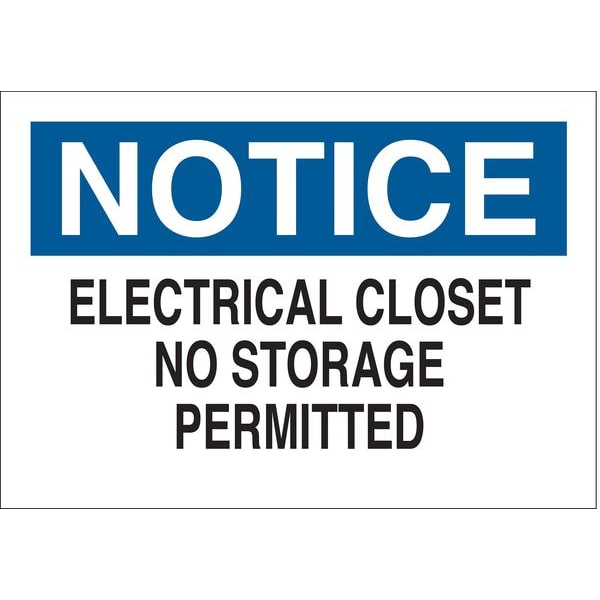 Notice Sign, Sign Subject Matter Electrical Hazard, Height 7 in, Width 10 in, Sign Material Polyester, Sign Mounting Style Adhesive Surface, Header Notice, Legend Electrical Closet No Storage Permitted, Printed Language English, Sign Shape Rectangle