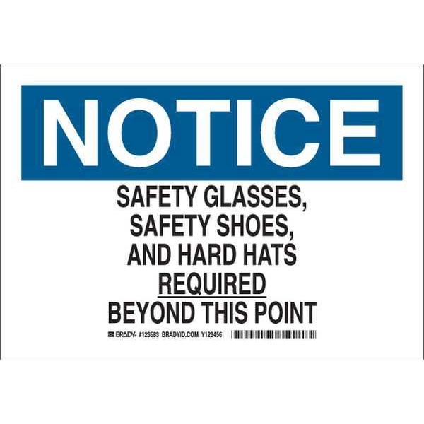 Notice Sign, Sign Subject Matter Personal Protection, Height 7 in, Width 10 in, Sign Material Plastic, Sign Mounting Style With Mounting Holes, Header Notice, Legend Safety Glasses, Safety Shoes, And Hard Hats Required Beyond This Point, Printed Language English, Sign Shape Rectangle
