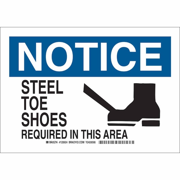 Notice Sign, Sign Subject Matter Personal Protection, Height 7 in, Width 10 in, Sign Material Plastic, Sign Mounting Style With Mounting Holes, Header Notice, Legend Steel Toe Shoes Required In This Area, Printed Language English, Sign Shape Rectangle