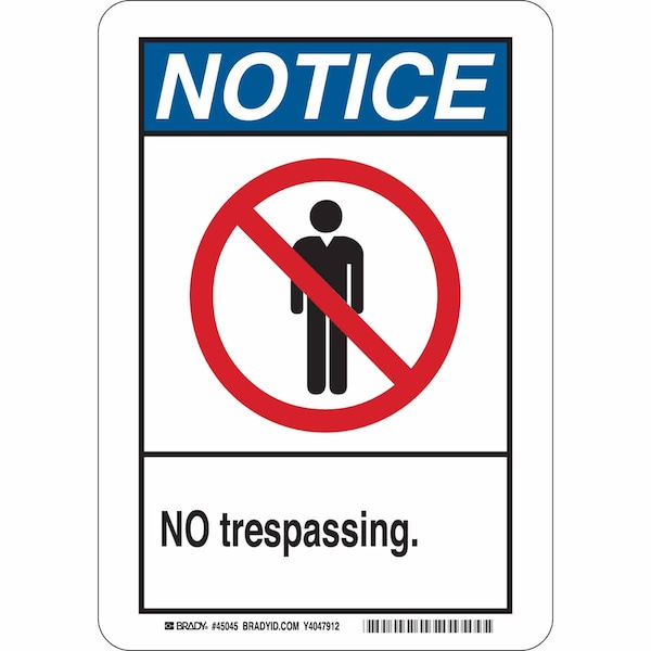Notice Sign, Sign Subject Matter Trespassing and Property, Height 10 in, Width 7 in, Sign Material Plastic, Sign Mounting Style With Mounting Holes, Header Notice, Legend No Trespassing., Printed Language English, Sign Shape Rectangle