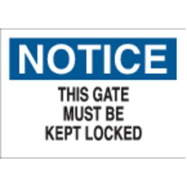 Notice Sign, Sign Subject Matter Lockout Tagout, Height 7 in, Width 10 in, Sign Material Polyester, Sign Mounting Style Adhesive Surface, Header Notice, Legend This Gate Must Be Kept Locked, Printed Language English, Sign Shape Rectangle