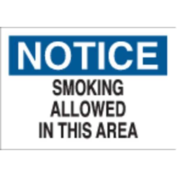 Smoking Area Sign, Sign Subject Matter No Smoking, Height 7 in, Width 10 in, Sign Material Polyester, Sign Mounting Style Adhesive Surface, Header Notice, Legend Smoking Allowed In This Area, Printed Language English, Sign Shape Rectangle