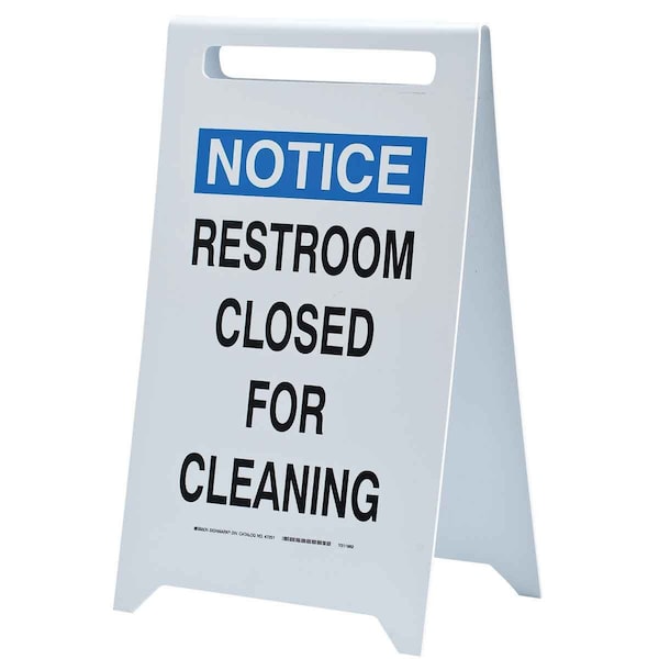 Restroom Sign, Sign Subject Matter Restrooms, Height 20 In., Width 12 In., Sign Material Plastic, Sign Mounting Style Free-Standing Floor, Header Notice, Legend Restroom Closed For Cleaning, Printed Language English, Sign Shape Rectangle