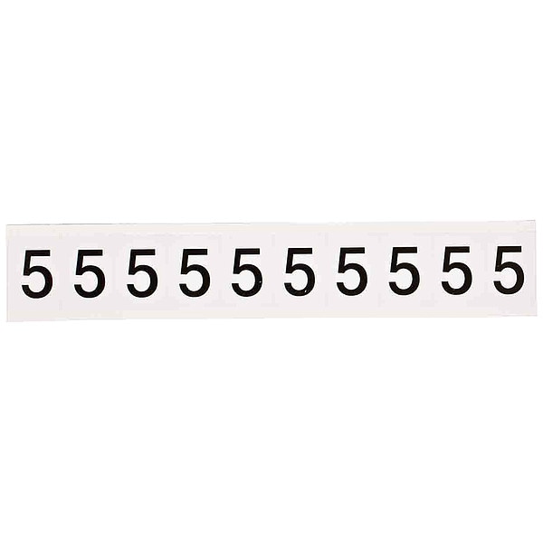 Number Label, Adhesive Type Permanent Adhesive, Application General Identification, Pipe and Valve Marking, APWA Compliant Color No, Background Color White, Character Color Black, Character Color Gradient Solid Color, Character Height 1 in, Character Outline Color Not Applicable, Character Type Numbers, Characters Included 5, Die Cut Yes, Embossed No, Font Helvetica, Includes (10) Labels, Indoor/Outdoor Usage Indoor/Outdoor, Letter Casing Uppercase, Material Vinyl