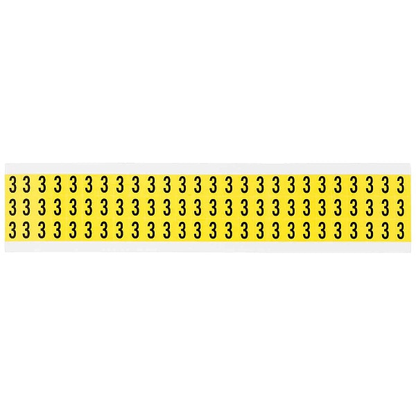 Number Label, Adhesive Type Removable and Repositionable Adhesive, Application General Identification, Wire and Cable Labeling, APWA Compliant Color No, Background Color Yellow, Character Color Black, Character Color Gradient Solid Color, Character Height 3/8 in, Character Outline Color Not Applicable, Character Type Numbers, Characters Included 3, Die Cut Yes, Embossed No, Font Gothic, Includes (78) Labels, Indoor/Outdoor Usage Indoor Only, Letter Casing Uppercase, Material Vinyl Cloth