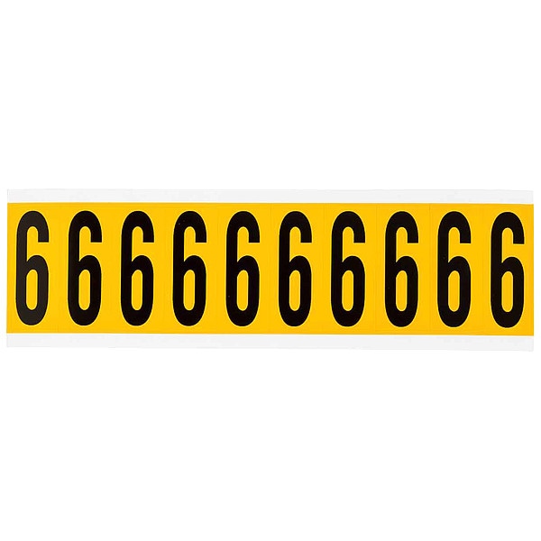 Number Label, Adhesive Type Permanent Adhesive, Application General Identification, Pipe and Valve Marking, APWA Compliant Color No, Background Color Yellow, Character Color Black, Character Color Gradient Solid Color, Character Height 1 15/16 in, Character Outline Color Not Applicable, Character Type Numbers, Characters Included 6 or 9, Die Cut Yes, Embossed No, Font Gothic, Includes (10) Labels, Indoor/Outdoor Usage Indoor/Outdoor, Letter Casing Uppercase, Material Vinyl