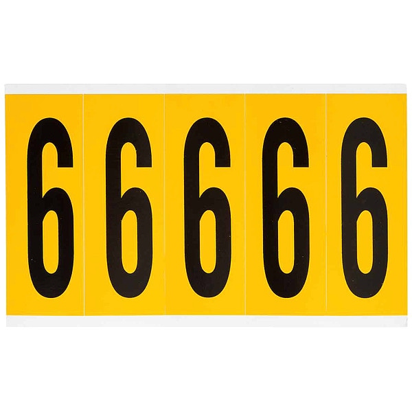 Number Label, Adhesive Type Permanent Adhesive, Application General Identification, Pipe and Valve Marking, APWA Compliant Color No, Background Color Yellow, Character Color Black, Character Color Gradient Solid Color, Character Height 3 7/8 in, Character Outline Color Not Applicable, Character Type Numbers, Characters Included 6 or 9, Die Cut Yes, Embossed No, Font Gothic, Includes (5) Labels, Indoor/Outdoor Usage Indoor/Outdoor, Letter Casing Uppercase, Material Vinyl