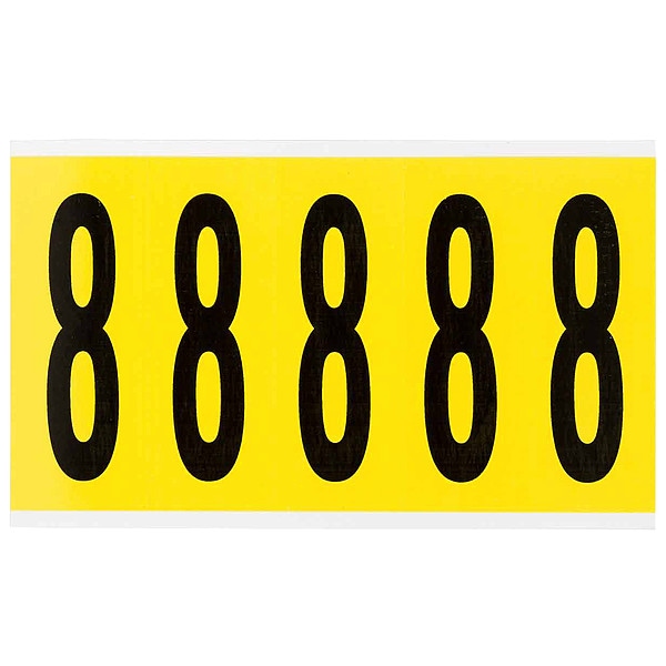 Number Label, Adhesive Type Removable and Repositionable Adhesive, Application General Identification, Wire and Cable Labeling, APWA Compliant Color No, Background Color Yellow, Character Color Black, Character Color Gradient Solid Color, Character Height 4 in, Character Outline Color Not Applicable, Character Type Numbers, Characters Included 8, Die Cut Yes, Embossed No, Font Gothic, Includes (5) Labels, Indoor/Outdoor Usage Indoor Only, Letter Casing Uppercase, Material Vinyl Cloth
