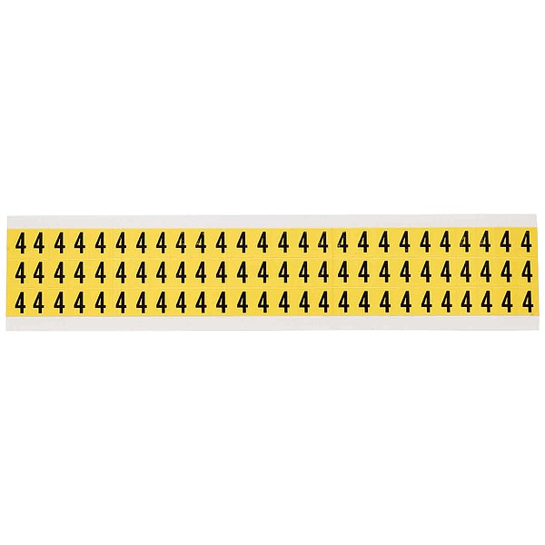 Number Label, Adhesive Type Removable and Repositionable Adhesive, Application General Identification, Wire and Cable Labeling, APWA Compliant Color No, Background Color Yellow, Character Color Black, Character Color Gradient Solid Color, Character Height 3/8 in, Character Outline Color Not Applicable, Character Type Numbers, Characters Included 4, Die Cut Yes, Embossed No, Font Gothic, Includes (78) Labels, Indoor/Outdoor Usage Indoor Only, Letter Casing Uppercase, Material Vinyl Cloth