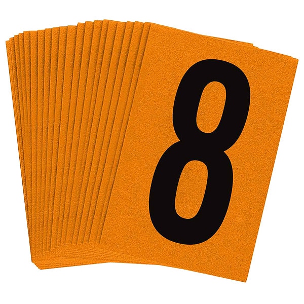 Number Label, Adhesive Type Permanent Adhesive, Application Utility Plant Markings, APWA Compliant Color No, Background Color Orange, Character Color Black, Character Color Gradient Solid Color, Character Height 1 in, Character Outline Color Not Applicable, Character Type Numbers, Characters Included 8, Die Cut Yes, Embossed No, Font Archivo Narrow, Includes (25) Labels, Indoor/Outdoor Usage Indoor/Outdoor, Letter Casing Uppercase, Material Retroreflective Sheeting