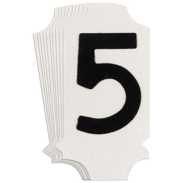 Number Label, Adhesive Type Permanent Adhesive, Application General Identification, APWA Compliant Color No, Background Color Not Applicable, Character Color Black, Character Color Gradient Solid Color, Character Height 1 in, Character Outline Color Not Applicable, Character Type Numbers, Characters Included 5, Die Cut Yes, Embossed No, Font Gothic, Includes (10) Labels, Indoor/Outdoor Usage Indoor/Outdoor, Letter Casing Uppercase, Material Polyester, Meets USCG Registration Guidelines No