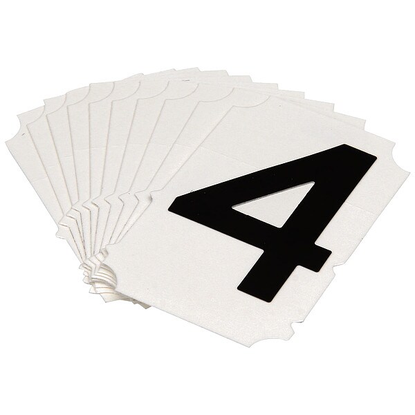Number Label, Adhesive Type Permanent Adhesive, Application General Identification, APWA Compliant Color No, Background Color Not Applicable, Character Color Black, Character Color Gradient Solid Color, Character Height 2 in, Character Outline Color Not Applicable, Character Type Numbers, Characters Included 4, Die Cut Yes, Embossed No, Font Gothic, Includes (10) Labels, Indoor/Outdoor Usage Indoor/Outdoor, Letter Casing Uppercase, Material Polyester, Meets USCG Registration Guidelines No