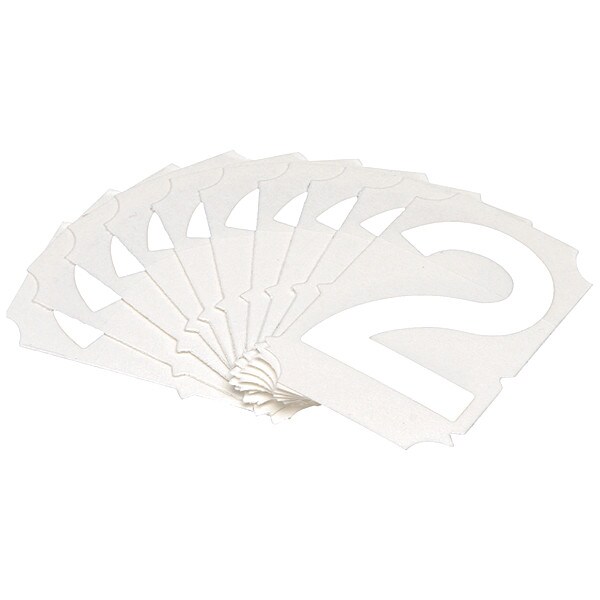 Number Label, Adhesive Type Permanent Adhesive, Application General Identification, APWA Compliant Color No, Background Color Not Applicable, Character Color White, Character Color Gradient Solid Color, Character Height 2 in, Character Outline Color Not Applicable, Character Type Numbers, Characters Included 2, Die Cut Yes, Embossed No, Font Gothic, Includes (10) Labels, Indoor/Outdoor Usage Indoor/Outdoor, Letter Casing Uppercase, Material Polyester, Meets USCG Registration Guidelines No