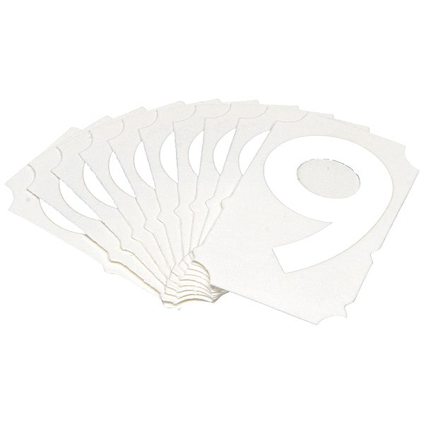 Number Label, Adhesive Type Permanent Adhesive, Application General Identification, APWA Compliant Color No, Background Color Not Applicable, Character Color White, Character Color Gradient Solid Color, Character Height 2 in, Character Outline Color Not Applicable, Character Type Numbers, Characters Included 6 or 9, Die Cut Yes, Embossed No, Font Gothic, Includes (10) Labels, Indoor/Outdoor Usage Indoor/Outdoor, Letter Casing Uppercase, Material Polyester, Meets USCG Registration Guidelines No