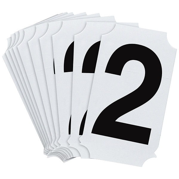 Number Label, Adhesive Type Permanent Adhesive, Application General Identification, APWA Compliant Color No, Background Color Not Applicable, Character Color Black, Character Color Gradient Solid Color, Character Height 2 in, Character Outline Color Not Applicable, Character Type Numbers, Characters Included 2, Die Cut Yes, Embossed No, Font Helvetica, Includes (10) Labels, Indoor/Outdoor Usage Indoor/Outdoor, Letter Casing Uppercase, Material Polyester, Meets USCG Registration Guidelines No