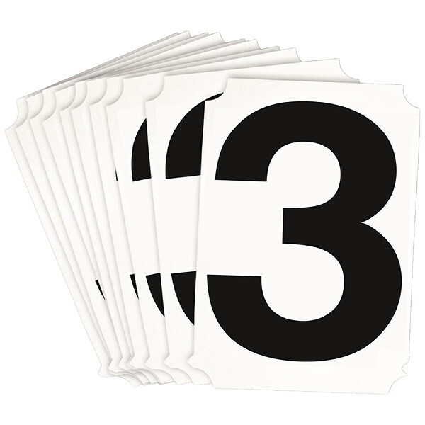 Number Label, Adhesive Type Permanent Adhesive, Application General Identification, APWA Compliant Color No, Background Color Not Applicable, Character Color Black, Character Color Gradient Solid Color, Character Height 3 in, Character Outline Color Not Applicable, Character Type Numbers, Characters Included 3, Die Cut Yes, Embossed No, Font Helvetica, Includes (10) Labels, Indoor/Outdoor Usage Indoor/Outdoor, Letter Casing Uppercase, Material Polyester, Meets USCG Registration Guidelines No