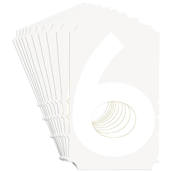 Number Label, Adhesive Type Permanent Adhesive, Application General Identification, APWA Compliant Color No, Background Color Not Applicable, Character Color White, Character Color Gradient Solid Color, Character Height 6 in, Character Outline Color Not Applicable, Character Type Numbers, Characters Included 6 or 9, Die Cut Yes, Embossed No, Font Gothic, Includes (10) Labels, Indoor/Outdoor Usage Indoor/Outdoor, Letter Casing Uppercase, Material Polyester, Meets USCG Registration Guidelines No