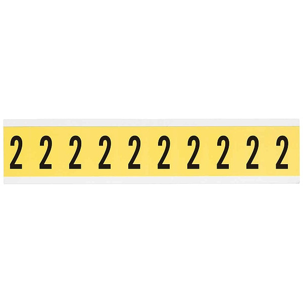 Number Label, Adhesive Type Removable and Repositionable Adhesive, Application General Identification, Wire and Cable Labeling, APWA Compliant Color No, Background Color Yellow, Character Color Black, Character Color Gradient Solid Color, Character Height 1 in, Character Outline Color Not Applicable, Character Type Numbers, Characters Included 2, Die Cut Yes, Embossed No, Font Gothic, Includes (10) Labels, Indoor/Outdoor Usage Indoor Only, Letter Casing Uppercase, Material Vinyl Cloth