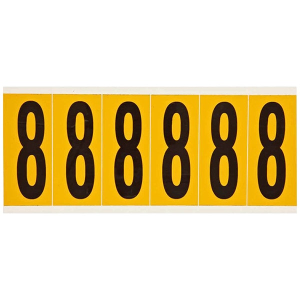 Number Label, Adhesive Type Permanent Adhesive, Application General Identification, Pipe and Valve Marking, APWA Compliant Color No, Background Color Yellow, Character Color Black, Character Color Gradient Solid Color, Character Height 3 in, Character Outline Color Not Applicable, Character Type Numbers, Characters Included 8, Die Cut Yes, Embossed No, Font Gothic, Includes (6) Labels, Indoor/Outdoor Usage Indoor/Outdoor, Letter Casing Uppercase, Material Vinyl