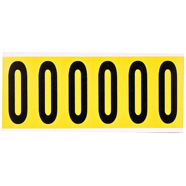 Number Label, Adhesive Type Removable and Repositionable Adhesive, Application General Identification, Wire and Cable Labeling, APWA Compliant Color No, Background Color Yellow, Character Color Black, Character Color Gradient Solid Color, Character Height 3 in, Character Outline Color Not Applicable, Character Type Numbers, Characters Included 0, Die Cut Yes, Embossed No, Font Gothic, Includes (6) Labels, Indoor/Outdoor Usage Indoor Only, Letter Casing Uppercase, Material Vinyl