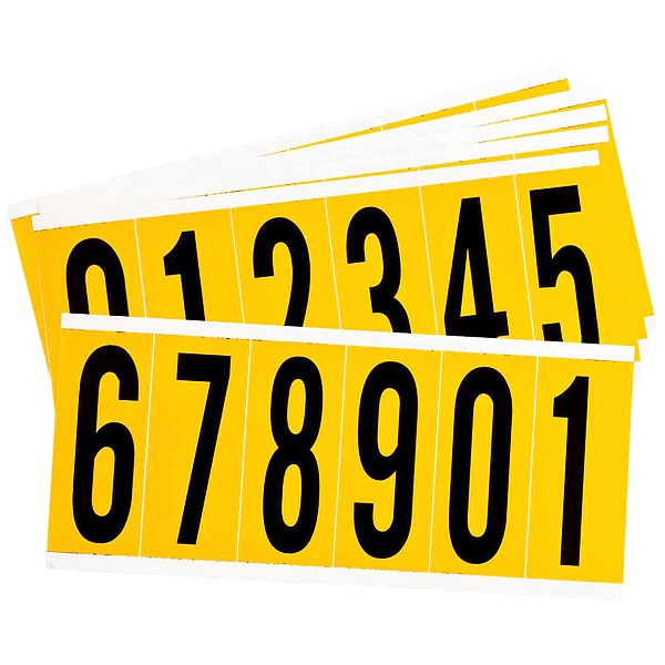 Number Label Set, Adhesive Type Permanent Adhesive, Application General Identification, Pipe and Valve Marking, APWA Compliant Color No, Background Color Yellow, Character Color Black, Character Color Gradient Solid Color, Character Height 3 in, Character Outline Color Not Applicable, Character Type Numbers, Characters Included 0 to 9, Die Cut Yes, Embossed No, Font Gothic, Includes (10) Markers 6 to 9, (15) Markers 2 to 5, (25) Markers 0 to 1, Indoor/Outdoor Usage Indoor/Outdoor