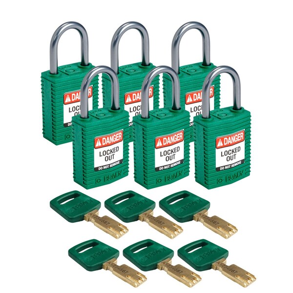 Stay ahead of technology. Brady SafeKey Lockout Padlocks, exclusively from Brady, provide ultimate key precision and advanced key security in your lockout program. Demand is growing for more unique key possibilities in lockout tagout - with SafeKey padlocks you get up to 700% more key codes than traditional safety padlocks. Patent-pending linear lock design allows for more precise key cutting, giving you more unique key codes and smoother key operation. Find it fast - keys and lock bodies are color matched to help you quickly find the key for your lock. Get years of use with the low-friction locking mechanism and durable one-piece body design. Nylon body with an aluminum shackle that features an anodized finish . To each their own - six padlocks are keyed differently so each lock gets its own key, making them ideal for simple lockout applications.