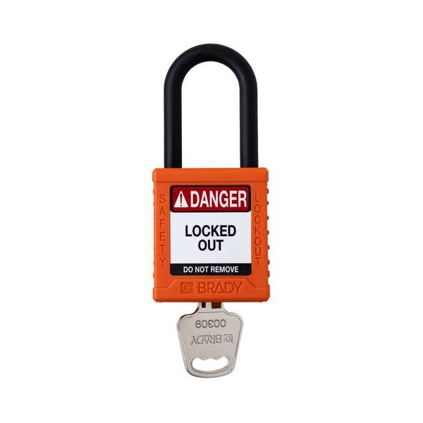 Padlock, Body Color Orange, Body Height 1 3/4 in, Body Material Nylon, Body Thickness 13/16 in, Body Width 1 1/2 in, Header Danger, Key Style Standard, Key Type Keyed Different, Non-Removable Key Yes, Resistance Properties Not Applicable, Shackle Diameter 1/4 in, Shackle Height 1 1/2 in, Shackle Material Plastic, Shackle Type Open, Vertical Shackle Clearance 1 1/2 in, Width Across Shackle Not Applicable, Control Key Registration Required No