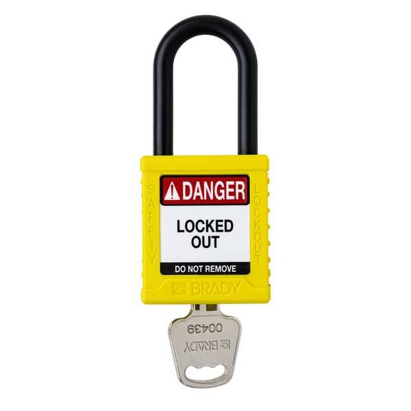 Padlock, Body Color Yellow, Body Height 1 3/4 in, Body Material Nylon, Body Thickness 13/16 in, Body Width 1 1/2 in, Header Danger, Key Style Standard, Key Type Keyed Different, Non-Removable Key Yes, Resistance Properties Not Applicable, Shackle Diameter 1/4 in, Shackle Height 1 1/2 in, Shackle Material Plastic, Shackle Type Open, Vertical Shackle Clearance 1 1/2 in, Width Across Shackle Not Applicable, Control Key Registration Required No