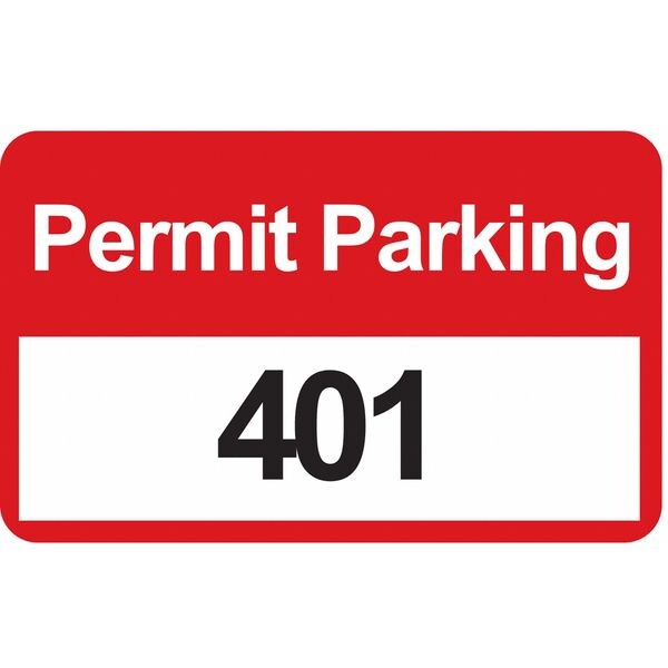 Parking Permits, Bumper Decal, Number Series 401-500, Material Vinyl, Color White on Red, Length 3 1/2 in, Width 2 in, Expiration Time -, Legend Parking Permit, For Use With -, Includes -, Package Quantity 100