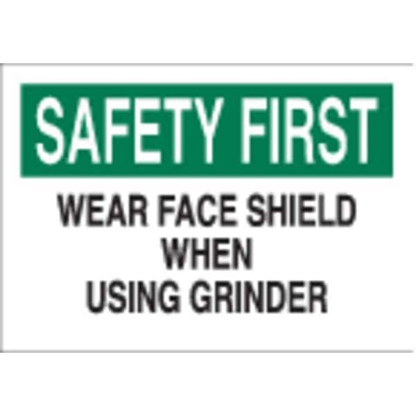 Personal Protection Sign, Sign Subject Matter Personal Protection, Height 10 in, Width 14 in, Sign Material Polyester, Sign Mounting Style Adhesive Surface, Header Safety First, Legend Wear Face Shield When Using Grinder, Printed Language English, Sign Shape Rectangle