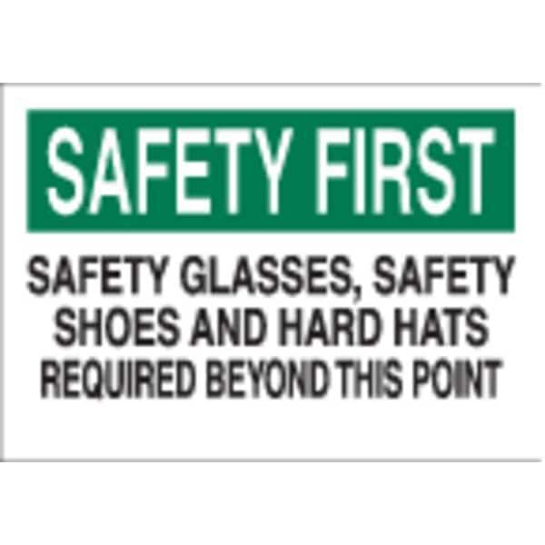 Personal Protection Sign, Sign Subject Matter Personal Protection, Height 7 in, Width 10 in, Sign Material Plastic, Sign Mounting Style With Mounting Holes, Header Safety First, Legend Safety Glasses, Safety Shoes and Hard Hats Required Beyond This Point, Printed Language English, Sign Shape Rectangle