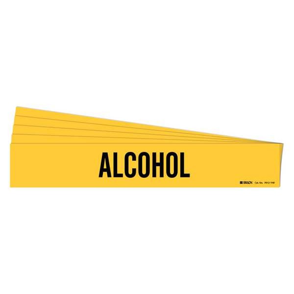 Pipe Marker, Pipe Marker Mounting Style Adhesive Pipe Marker, Pipe Marker Legend Alcohol, Legend Text Color Black, IIAR System Abbreviation Not Applicable, IIAR Phase Not Applicable, IIAR Pressure Level Not Applicable, Character Height 3 1/2 in, Background Color Yellow, With or Without Arrows Without, Package Quantity 5
