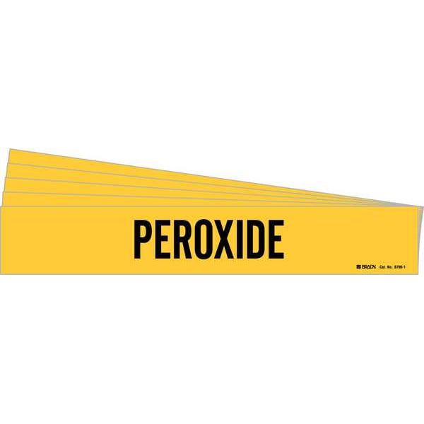 Pipe Marker, Pipe Marker Mounting Style Adhesive Pipe Marker, Pipe Marker Legend Peroxide, Legend Text Color Black, IIAR System Abbreviation Not Applicable, IIAR Phase Not Applicable, IIAR Pressure Level Not Applicable, Character Height 2 in, Background Color Yellow, With or Without Arrows Without, Package Quantity 5