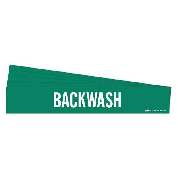 Pipe Marker, Pipe Marker Mounting Style Adhesive Pipe Marker, Pipe Marker Legend Backwash, Legend Text Color White, IIAR System Abbreviation Not Applicable, IIAR Phase Not Applicable, IIAR Pressure Level Not Applicable, Character Height 3 1/2 in, Background Color Green, With or Without Arrows Without, Package Quantity 5