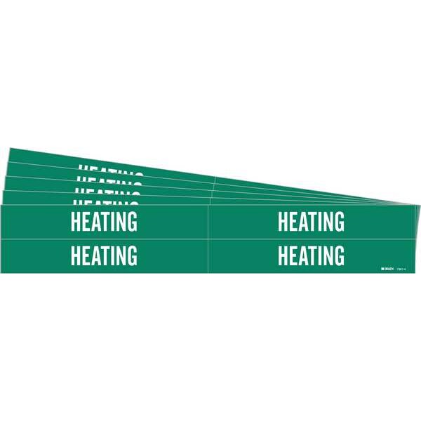 Pipe Marker, Pipe Marker Mounting Style Adhesive Pipe Marker, Pipe Marker Legend Heating, Legend Text Color White, IIAR System Abbreviation Not Applicable, IIAR Phase Not Applicable, IIAR Pressure Level Not Applicable, Character Height 3/4 in, Background Color Green, With or Without Arrows Without, Package Quantity 5