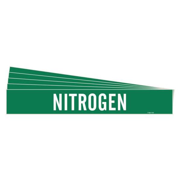 Pipe Marker, Pipe Marker Mounting Style Adhesive Pipe Marker, Pipe Marker Legend Nitrogen, Legend Text Color White, IIAR System Abbreviation Not Applicable, IIAR Phase Not Applicable, IIAR Pressure Level Not Applicable, Character Height 3 1/2 in, Background Color Green, With or Without Arrows Without, Package Quantity 5