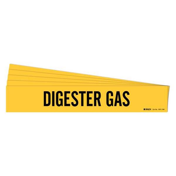 Pipe Marker, Pipe Marker Mounting Style Adhesive Pipe Marker, Pipe Marker Legend Digester Gas, Legend Text Color Black, IIAR System Abbreviation Not Applicable, IIAR Phase Not Applicable, IIAR Pressure Level Not Applicable, Character Height 3 1/2 in, Background Color Yellow, With or Without Arrows Without, Package Quantity 5