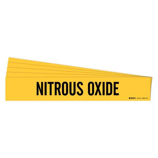 Pipe Marker, Pipe Marker Mounting Style Adhesive Pipe Marker, Pipe Marker Legend Nitrous Oxide, Legend Text Color Black, IIAR System Abbreviation Not Applicable, IIAR Phase Not Applicable, IIAR Pressure Level Not Applicable, Character Height 3 1/2 in, Background Color Yellow, With or Without Arrows Without, Package Quantity 5
