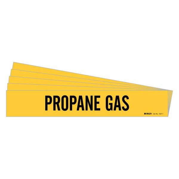 Pipe Marker, Pipe Marker Mounting Style Adhesive Pipe Marker, Pipe Marker Legend Propane Gas, Legend Text Color Black, IIAR System Abbreviation Not Applicable, IIAR Phase Not Applicable, IIAR Pressure Level Not Applicable, Character Height 2 in, Background Color Yellow, With or Without Arrows Without, Package Quantity 5