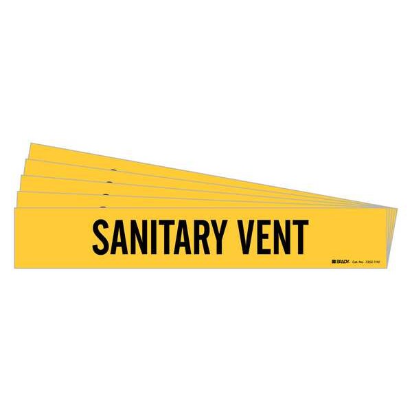 Pipe Marker, Pipe Marker Mounting Style Adhesive Pipe Marker, Pipe Marker Legend Sanitary Vent, Legend Text Color Black, Character Height 3 1/2 in, Background Color Yellow, With or Without Arrows Without, Package Quantity 5