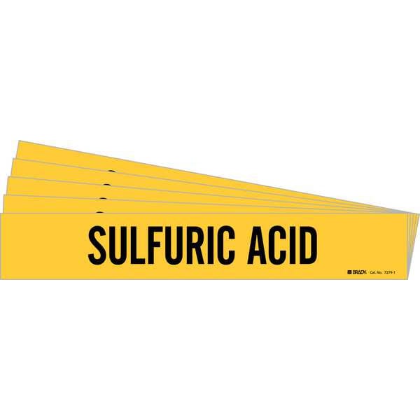 Pipe Marker, Pipe Marker Mounting Style Adhesive Pipe Marker, Pipe Marker Legend Sulfuric Acid, Legend Text Color Black, IIAR System Abbreviation Not Applicable, IIAR Phase Not Applicable, IIAR Pressure Level Not Applicable, Character Height 2 in, Background Color Yellow, With or Without Arrows Without, Package Quantity 5