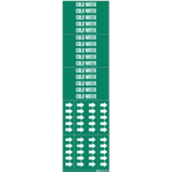Pipe Marker, Pipe Marker Mounting Style Adhesive Pipe Marker, Pipe Marker Legend Cold Water, Legend Text Color White, Character Height 1/2 in, Background Color Green, With or Without Arrows Without