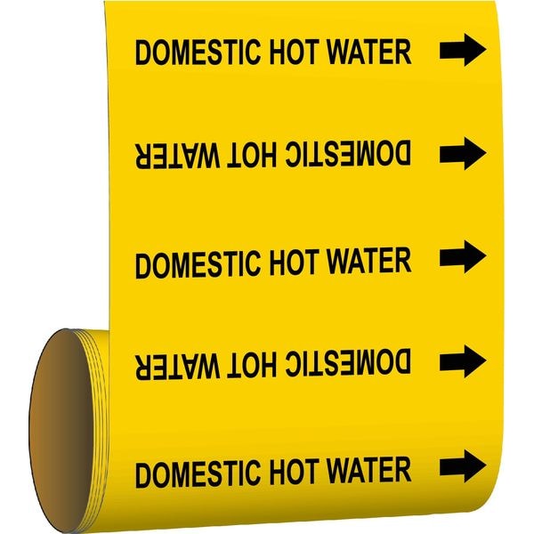Pipe Marker, Pipe Marker Mounting Style Adhesive Pipe Marker, Pipe Marker Legend Domestic Hot Water, Legend Text Color Black, Character Height 3/4 in, Background Color Yellow, With or Without Arrows With