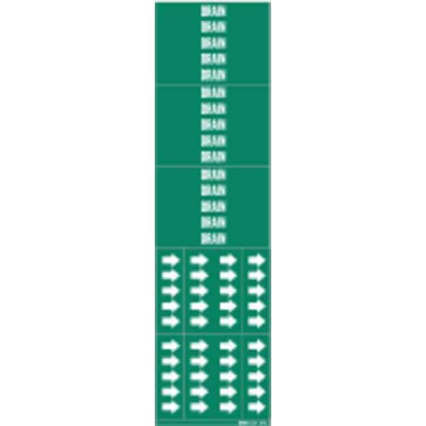 Pipe Marker, Pipe Marker Mounting Style Adhesive Pipe Marker, Pipe Marker Legend Drain, Legend Text Color White, Character Height 1/2 in, Background Color Green, With or Without Arrows Without