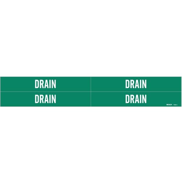 Pipe Marker, Pipe Marker Mounting Style Adhesive Pipe Marker, Pipe Marker Legend Drain, Legend Text Color White, Character Height 3/4 in, Background Color Green, With or Without Arrows Without