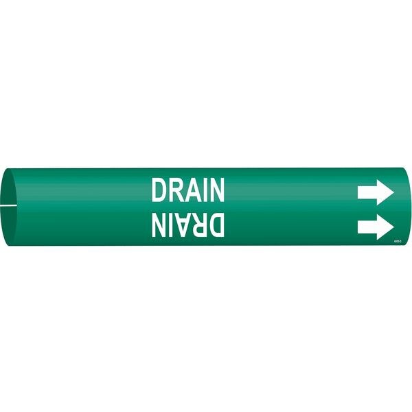 Pipe Marker, Pipe Marker Mounting Style Snap-On Pipe Marker, Pipe Marker Legend Drain, Legend Text Color White, Character Height 1 1/4 in, Background Color Green, With or Without Arrows With