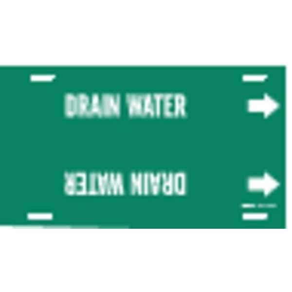 Pipe Marker, Pipe Marker Mounting Style Strap-On Pipe Marker, Pipe Marker Legend Drain Water, Legend Text Color White, Character Height 2 1/2 in, Background Color Green, With or Without Arrows With