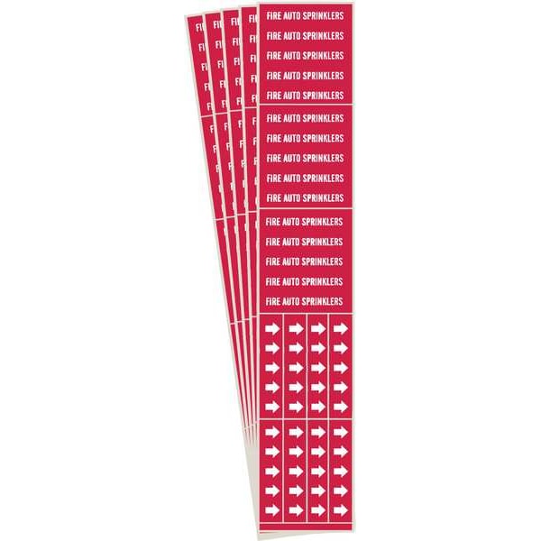 Pipe Marker, Pipe Marker Mounting Style Adhesive Pipe Marker, Pipe Marker Legend Fire Auto Sprinklers, Legend Text Color White, IIAR System Abbreviation Not Applicable, IIAR Phase Not Applicable, IIAR Pressure Level Not Applicable, Character Height 1/2 in, Background Color Red, With or Without Arrows With, Package Quantity 5